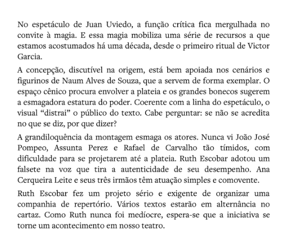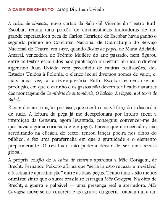 Parte del libro «Amor ao teatro: Sábato Magaldi», por Sábato Magaldi, sobre el montaje «A Caixa de Cimento».