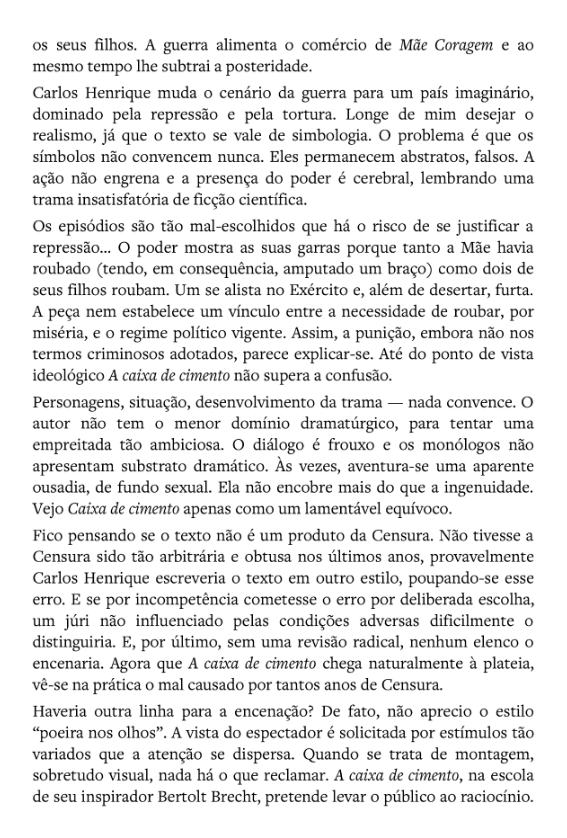 Fico pensando se o texto não é um produto da Censura. Não tivesse a Censura sido tão arbitrária e obtusa nos últimos anos, provavelmente Carlos Henrique escreveria o texto em outro estilo, poupando-se esse erro. E, se por incompetência cometesse o erro por deliberada escolha, um júri não influenciado pelas condições adversas dificilmente o distinguiria. E, por último, sem uma revisão radical, nenhum elenco o encenaria. Agora que A caixa de cimento chega naturalmente à plateia, vê-se na prática o mal causado por tantos anos de Censura.